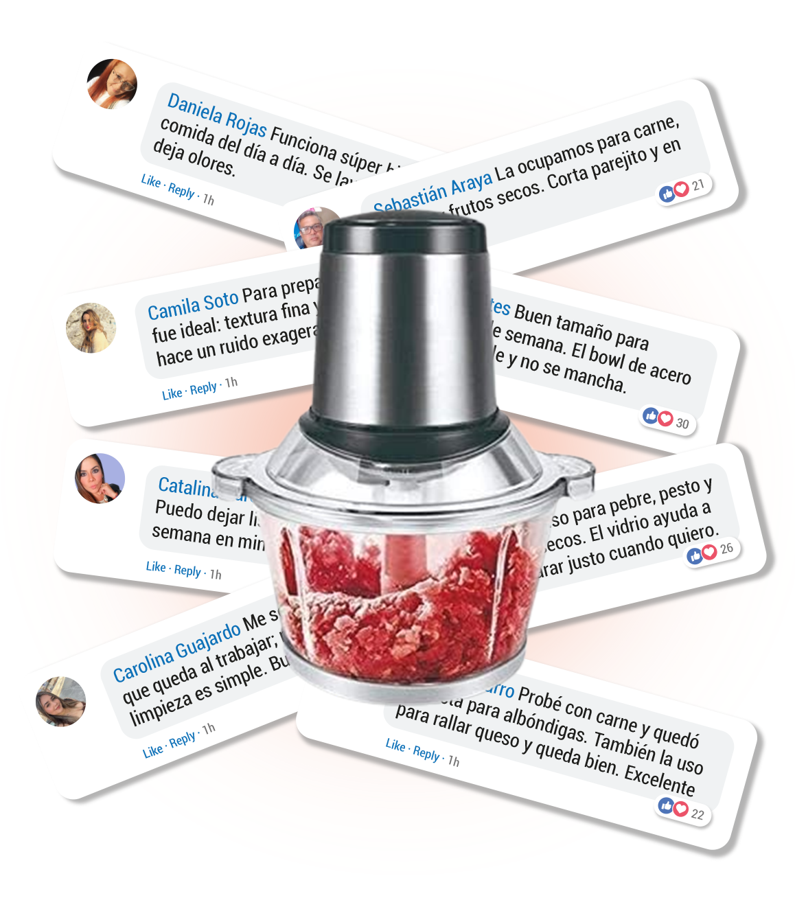 Porque deja tus ingredientes listos en segundos con su motor silencioso de 350W y su función 3 en 1: tritura, pica y mezcla sin esfuerzo.