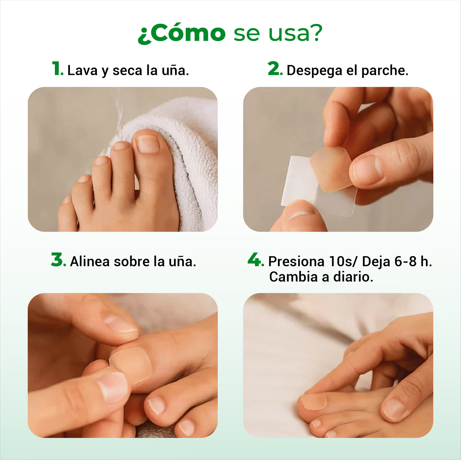 Se recomienda aplicar un parche al día sobre la uña limpia y seca, preferiblemente por la noche. Retíralo y cámbialo cada 24 horas, manteniendo el uso constante para apoyar el cuidado y la apariencia saludable de la uña.